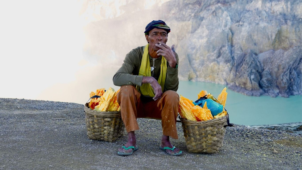On the trail, we’re passed a couple of times by sulphur miners - shirtless, weathered, and carrying heavy baskets filled with jagged sulphur stalactites on their shoulders. Each of them has a cigarette dangling from their mouth, seemingly unfazed by the choking fumes around them. Their movements are steady and silent, a stark contrast to the tourists, and a sobering reminder of the daily reality here. I’m later informed that many of the miners don’t wear masks at all - preferring the cigarette smoke to the sulphur fumes. The average life expectancy for these men is said to be in the mid-30s.